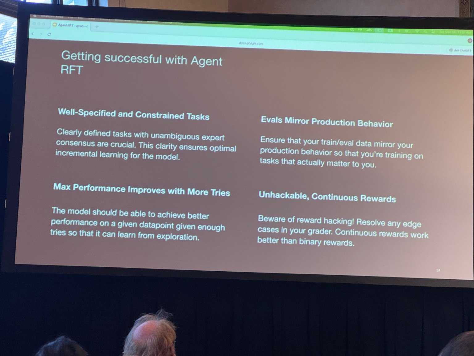 Agent RFTは、ツールを使用するエージェント向けに適応された強化学習型ファインチューニングとして紹介され、モデルがトレーニング中のロールアウトで異なる戦略を探索し、採点者から学習信号を受け取る仕組みである。OpenAIのドキュメントでは、このループを候補応答をサンプリングし、定義した採点者でスコアリングし、そのスコアに基づいてモデルを更新するプロセスとして説明している。Hang氏は、軌跡全体にわたるクレジット割り当てを強調し、ツール選択やツールコール構造を含む初期の決定が下流の結果に基づいて強化または抑制される可能性があると述べた。彼は、エージェントをツールを通じて外界と相互作用できるシステムとして説明し、単にユーザープロンプトに応答するだけではないと述べた。