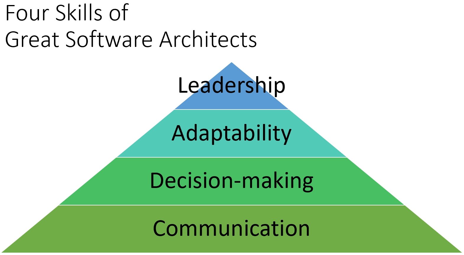 以前の講演で、私はアーキテクトが日々実践するべき4つの基本的なスキルを取り上げた。まず、すべての基本はコミュニケーションである。2つ目は意思決定。3つ目は変化に適応できること。4つ目はリーダーシップだ。これらはすべて重要であり、その日その日で、どれかに重点を置く必要があるかもしれない。しかし、下記が基本的なランクであり、それらが互いにどのように積み重なっていくかを示している。