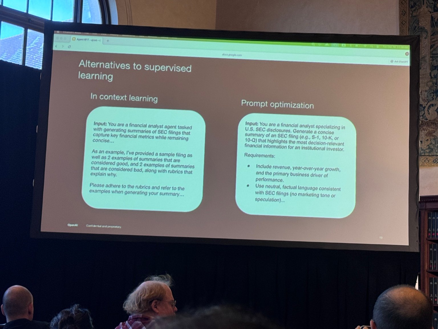 彼はファインチューニングの選択肢をスペクトラムとして位置付けた。教師ありファインチューニングは、入力から出力への予測可能なマッピングが存在し、一定のスタイルや構造を模倣することが目標である場合に効果的であると説明された。選好最適化は、ペア比較を使用して出力を好ましい応答にシフトさせる方法として説明され、OpenAIのDirect Preference Optimizationガイドでは、モデル出力を比較することでファインチューニングを行う方法として記載されている。現在、この手法はテキスト入力と出力に限定されていると述べられている。強化学習型ファインチューニングは、モデルが長い軌跡を通じて戦略を発見する必要があるタスクに適しており、単一のデモンストレーション完了パターンを再現するよりも効果的であると強調された。