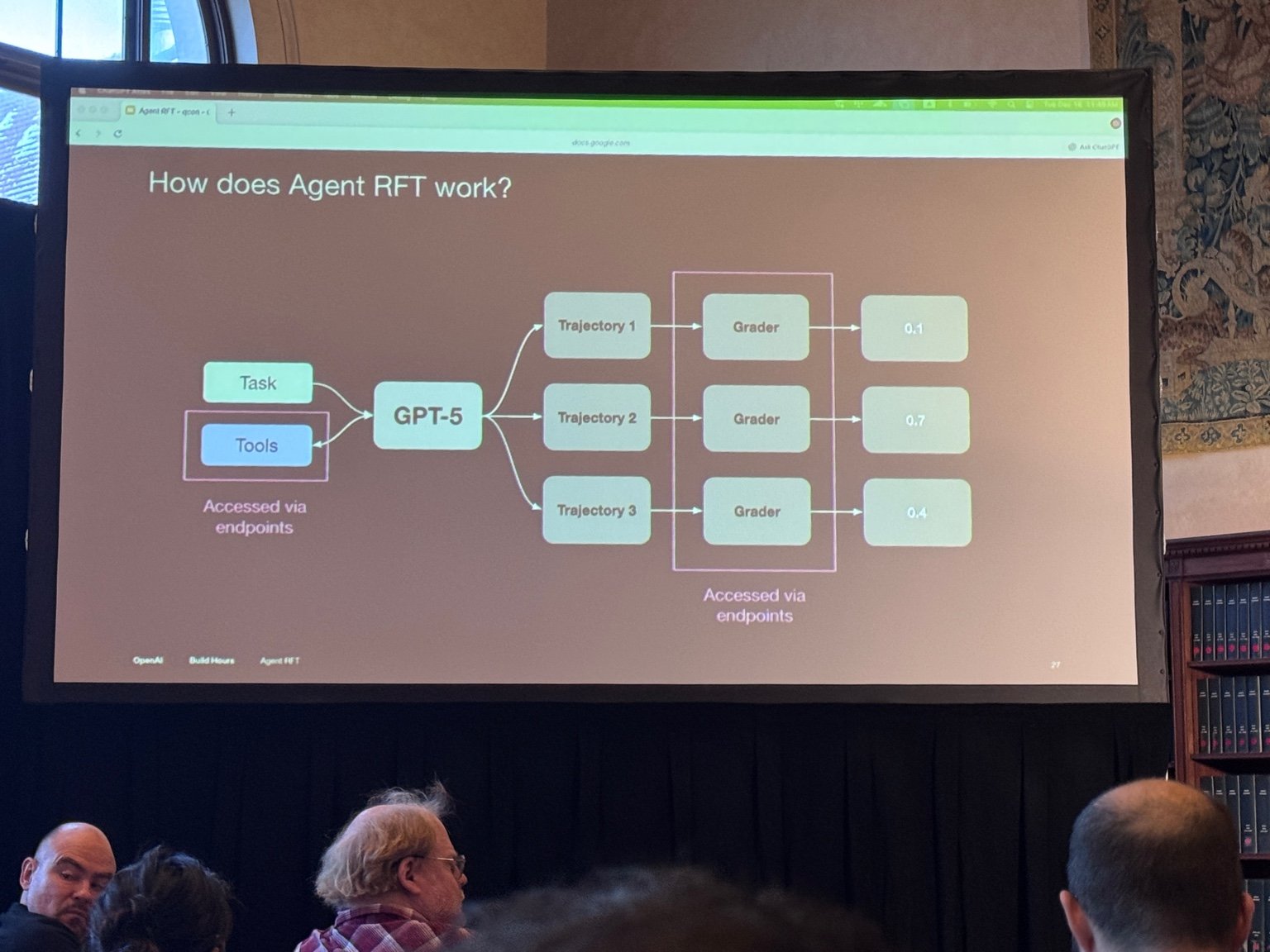 Agent RFTは、ツールを使用するエージェント向けに適応された強化学習型ファインチューニングとして紹介され、モデルがトレーニング中のロールアウトで異なる戦略を探索し、採点者から学習信号を受け取る仕組みである。OpenAIのドキュメントでは、このループを候補応答をサンプリングし、定義した採点者でスコアリングし、そのスコアに基づいてモデルを更新するプロセスとして説明している。Hang氏は、軌跡全体にわたるクレジット割り当てを強調し、ツール選択やツールコール構造を含む初期の決定が下流の結果に基づいて強化または抑制される可能性があると述べた。彼は、エージェントをツールを通じて外界と相互作用できるシステムとして説明し、単にユーザープロンプトに応答するだけではないと述べた。