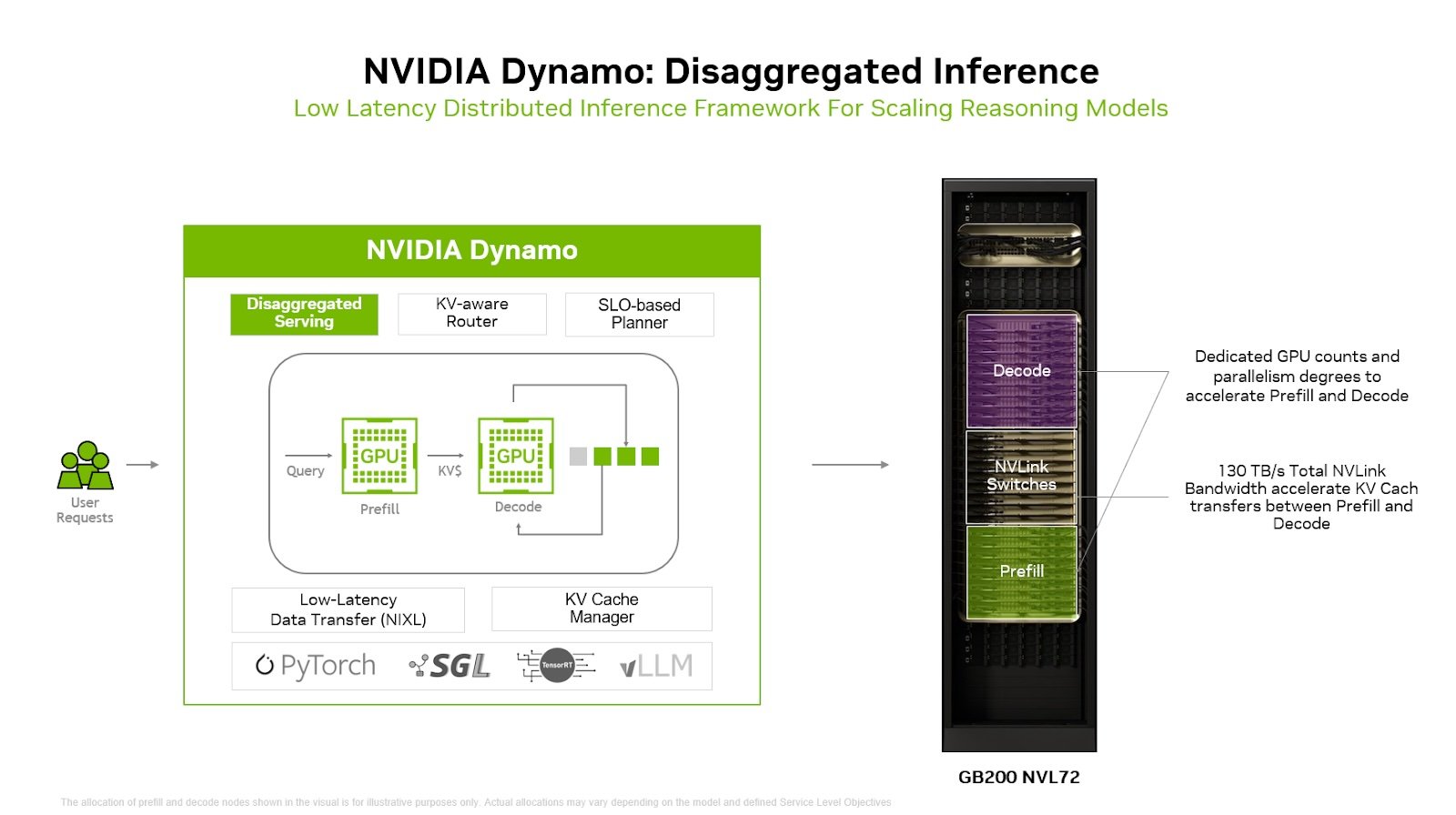 この課題は、推論スタックにおける革新を生み出している。そこで登場するのがDynamoである。Dynamoは、分散推論のためのオープンソースフレームワークであり、GPUやノード間の実行を管理する。推論をプレフィルやデコードなどのフェーズに分割し、メモリバウンドタスクとコンピュートバウンドタスクを分離する。また、GPUリソースを動的に管理し、使用率を向上させ、レイテンシを低く保つ。