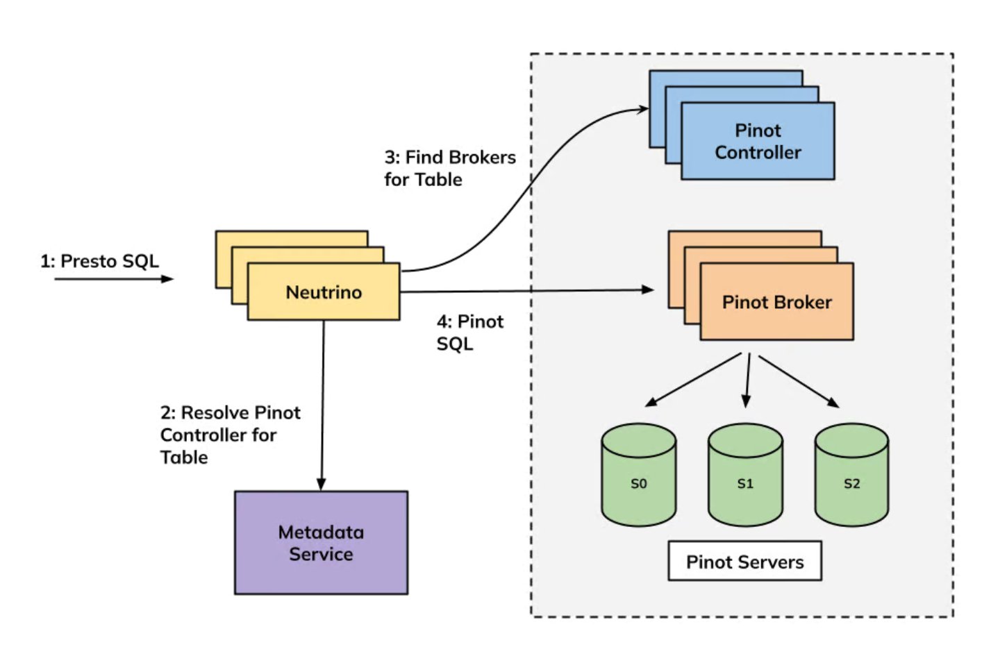 従来、Neutrinoは、Prestoのコーディネーターとワーカーのプロセスを組み合わせたステートレスなマイクロサービスとして運用されていた。ユーザーが送信したPrestoSQLクエリは、一部がPinotSQLとしてPinotにプッシュダウンされ、残りのクエリロジックはNeutrino内で実行されていた。各クエリには、フルテーブルスキャンのリスクを軽減するために、デフォルトまたはユーザー定義の制限が含まれていた。しかし、これらの安全策にもかかわらず、層状のアーキテクチャは複雑なセマンティクスを生み出し、クエリプランの解釈を難しくし、同じプロキシを共有するテナント間の隔離を制限していた。